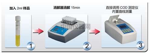 加入2ml樣品→消解器消解15min→直接調(diào)用COD測定儀 內(nèi)置曲線測量