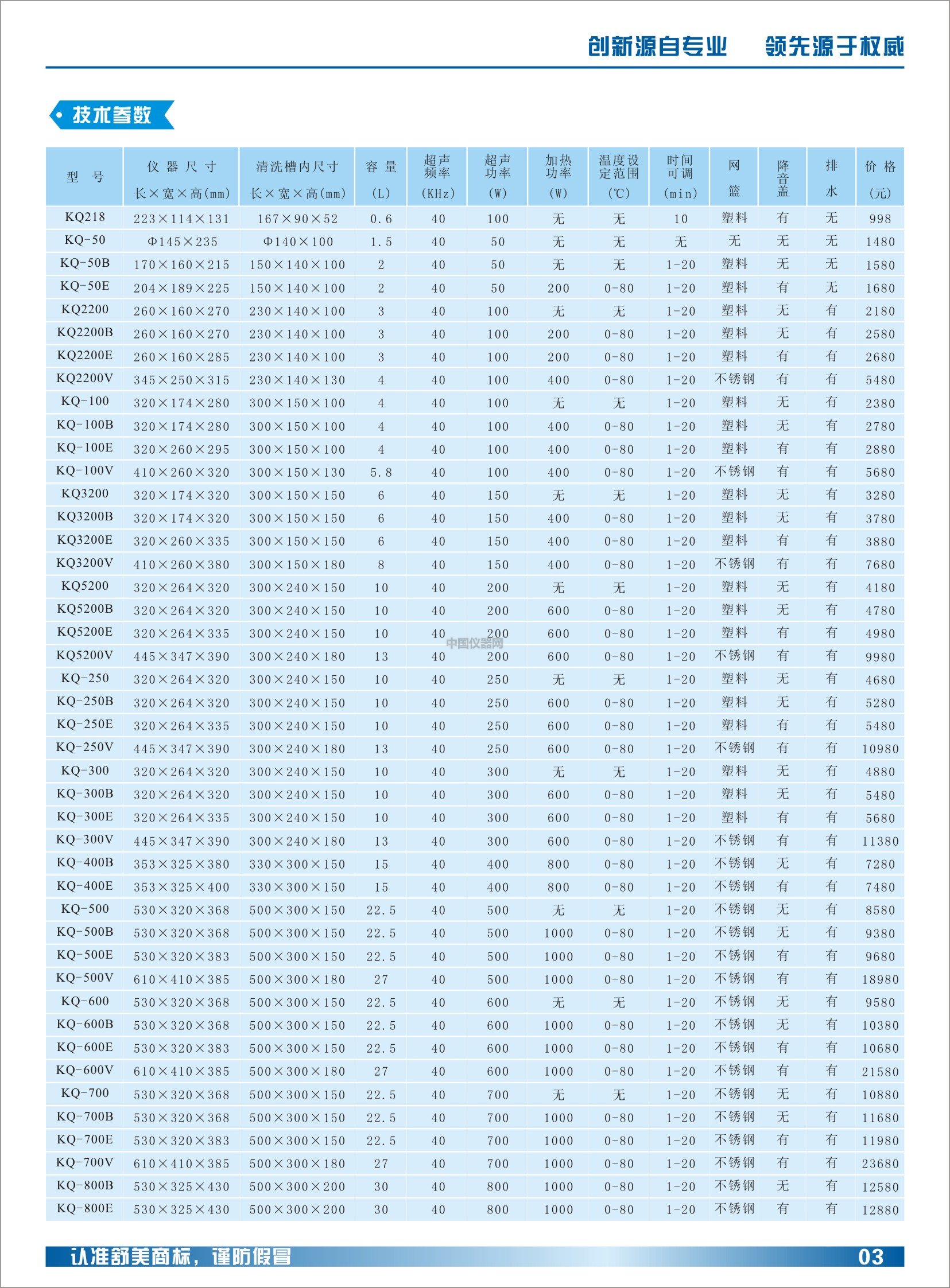 KQ5200超聲波清洗器 主要技術參數 型號:KQ5200 外形尺寸:320*264*320mm 內槽尺寸:300*240*150mm 容量:10L 超聲頻率:40KHz 頻率轉換時間可調:— 選配超聲頻率:20、25、28、33、40KHz 超聲功率:200W 超聲功率可調范圍:— 水位顯示:— 加熱功率:— 制冷功率:— 溫度設定范圍:— 工作時間可調:1-20min 溶液過濾:— 其他配置:手控進排水、塑料網籃、220V/50Hz電源 官方價格: 4180元 主要性能特點 經典機械式操作控制 清洗器主體材質為304不銹鋼 清洗器電路及器件升級并匹配 清洗器電路具有自動掃頻功能 標配常規換能器功率50W/個、頻率40KHz