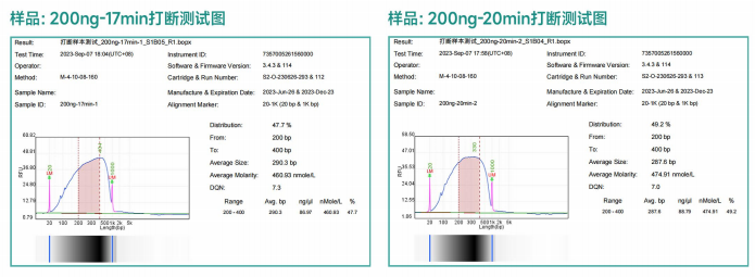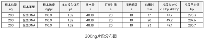 現針對提取的一管全血DNA樣本,投入量分別是200ng加入到0.2ml離心管中,具體實驗條件及打斷后的片段分布圖如下: