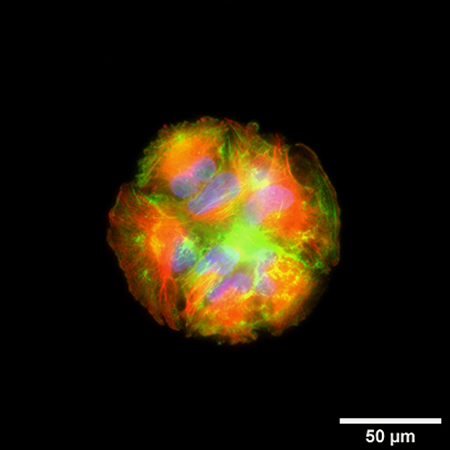 將RCC-26(人類腎癌)細胞接種到帶有多細胞µ-Pattern的µ-Slide VI 0.4中24小時后進行免疫熒光染色。 綠色:F-肌動蛋白(phalloidin),紅色:+++ α-管蛋白,藍色:核(DAPI)。 廣角熒光顯微鏡,60倍物鏡。